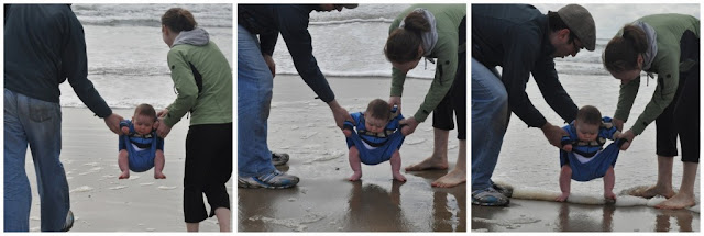 It was really ideal weather, too. The forecast had been for rain, and after some spotty showers in the morning it was sunny and mild the rest of the day! Manzanita is a gorgeous beach and it was so nice to be next to the ocean and hear it's roar. Even Noam's BOB got to dip its wheels in the Pacific.Of course, the trip to the coast wasn't complete until Noam put his toes in the ocean! Avi and Ben found a pretty creative way to carry the little guy to the water. He wasn't too sure at first, but then again the water was around 50 or so degrees!