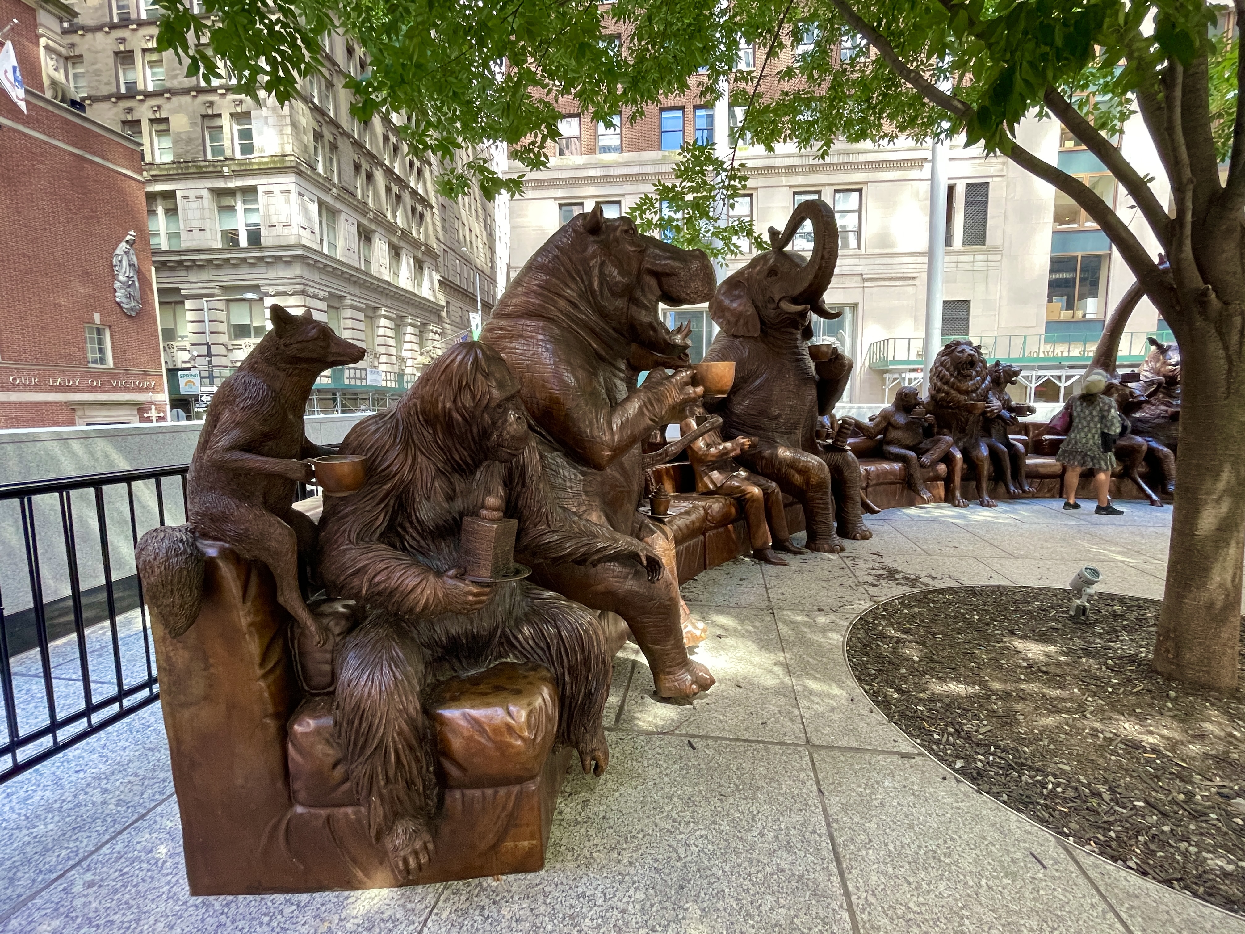 Down by Wall Stree, there is a whimsical meets thought-provoking art install called "The Wild Couch Party." It is a huge sectional "sofa" filled bronze sculptures of various endangered animals by artists Gillie and Marc, each is interactive in some way, inviting people to engage with the animals in a variety of ways.